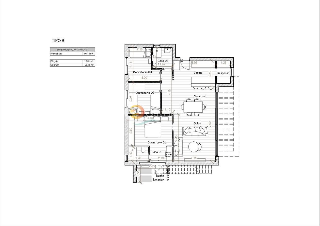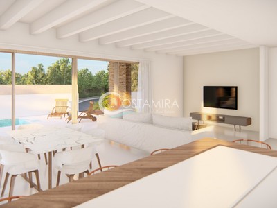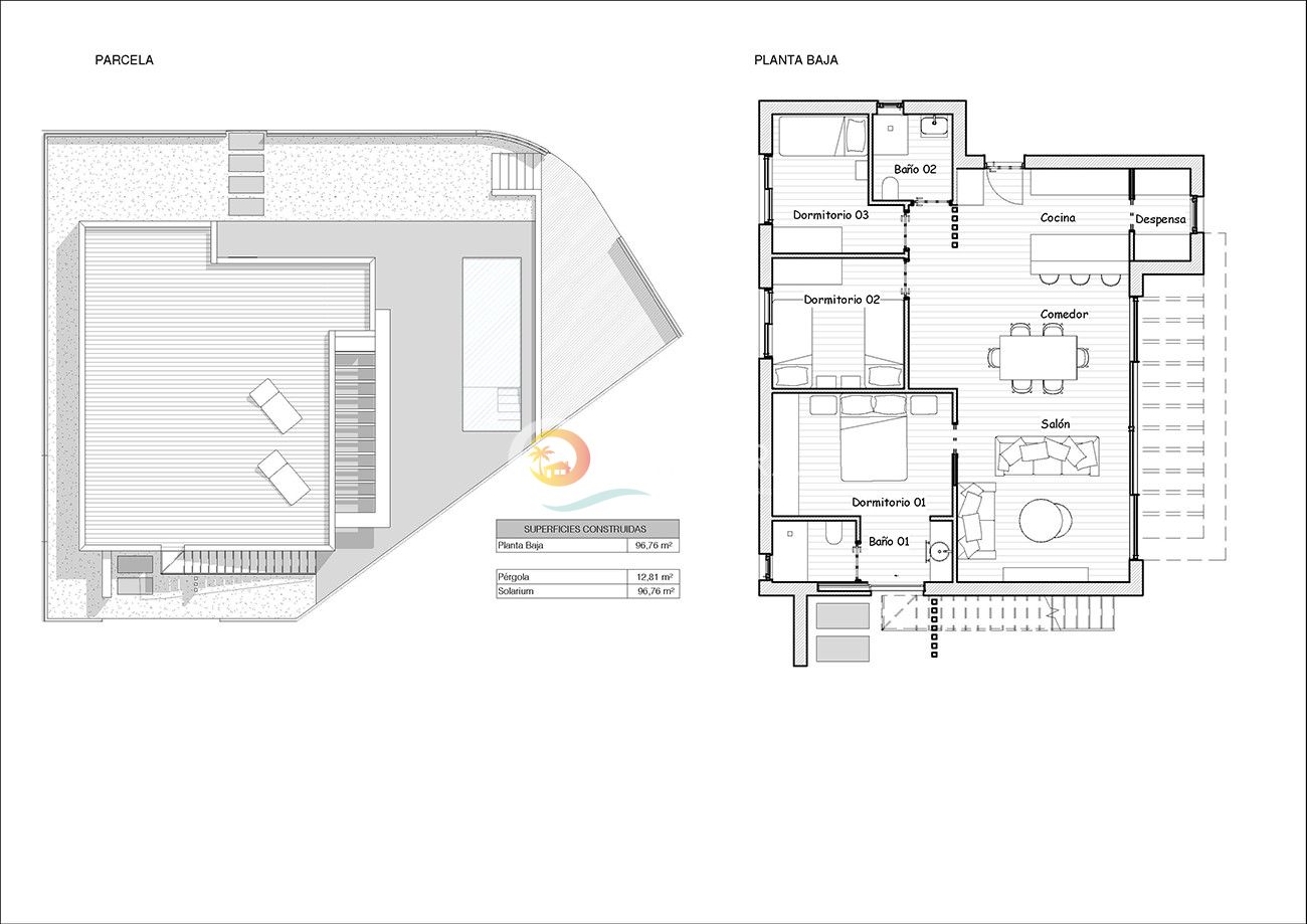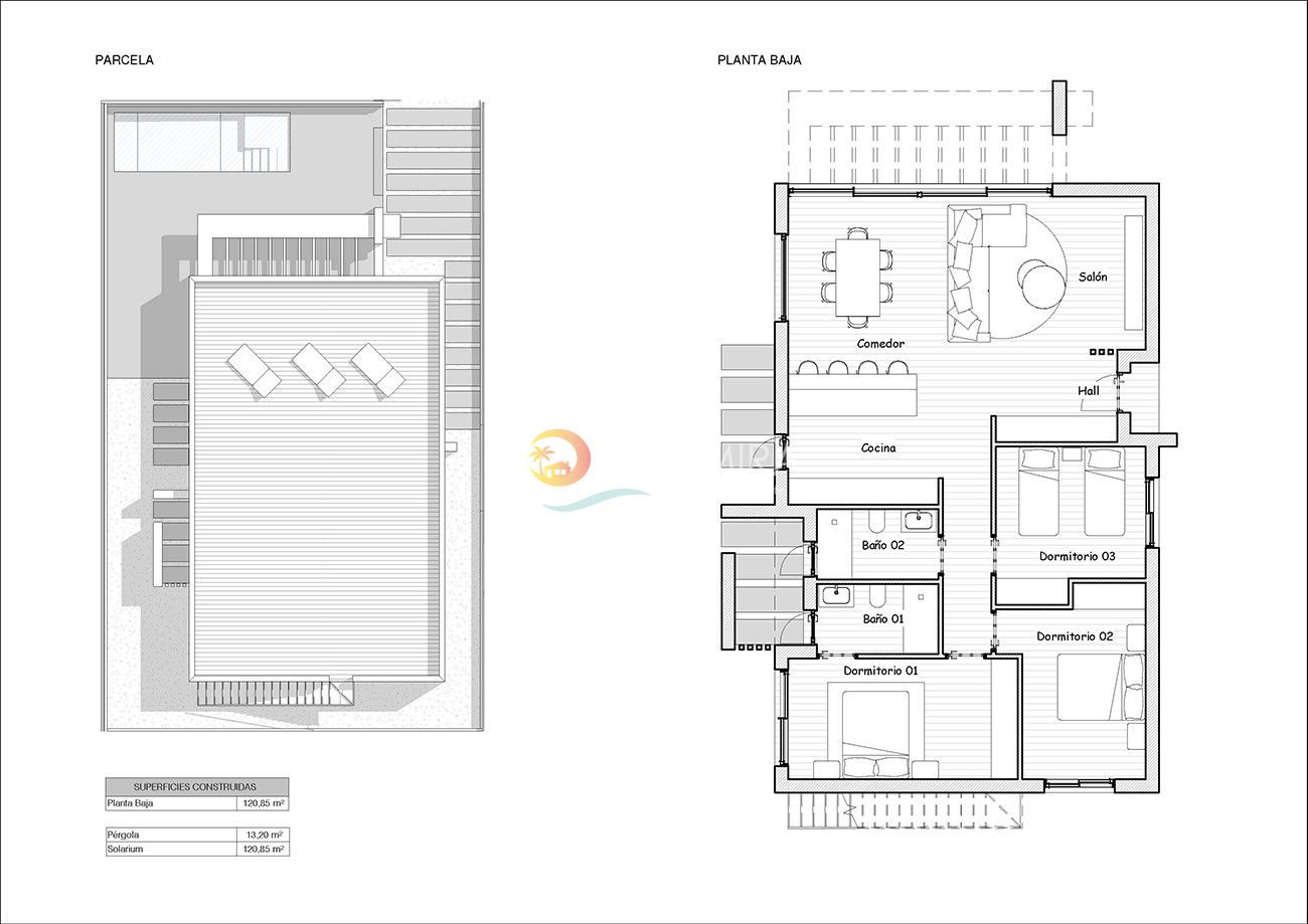 Existen tres tipos diferentes de chalet a elegir, que varían entre los 90 y los 121 m2 construidos, sobre parcelas que van desde los 237 m2 a los 280 m2, todos cuentan con 3 habitaciones y 2 baños, salón comedor con cocina de concepto abierto, un bonito porche delantero con vistas al jardín y a la piscina privada y también solárium (opcional).