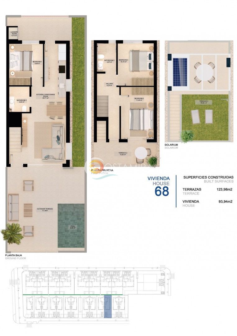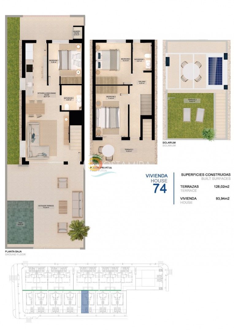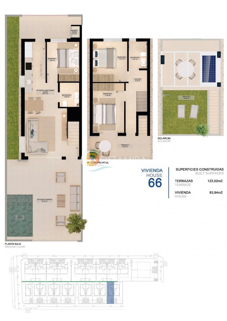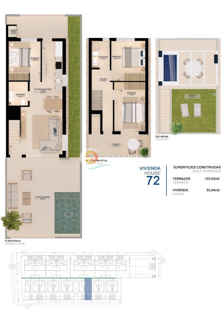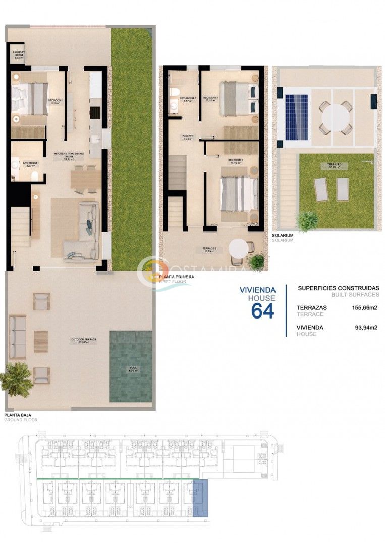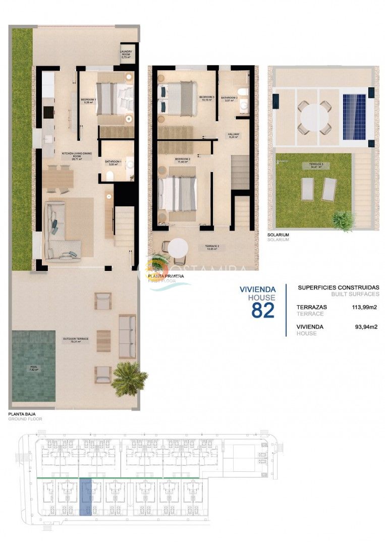 Cada dúplex cuenta con tres habitaciones y dos baños, distribuidos en una superficie de terrazas que varía de 114 a 156 m², incluyendo la planta baja, la primera planta y un solárium privado. La planta baja se abre a un salón y cocina de concepto abierto, creando un espacio acogedor y funcional que se extiende hasta el jardín privado. Aquí, la piscina privada se convierte en el centro de tu santuario personal, un lugar para relajarse o entretenerse.